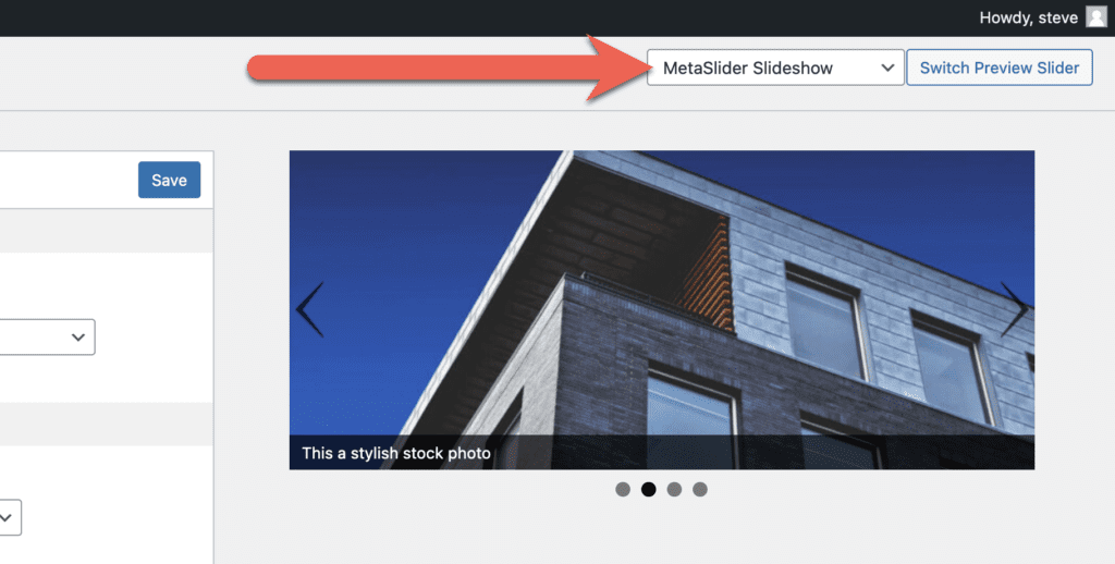 On the top of the screen, choose a slideshow you have already created. MetaSlider will use this as a preview, so you can get an accurate idea of how your theme looks. In this example, the caption is in the bottom-left corner of the slideshow.