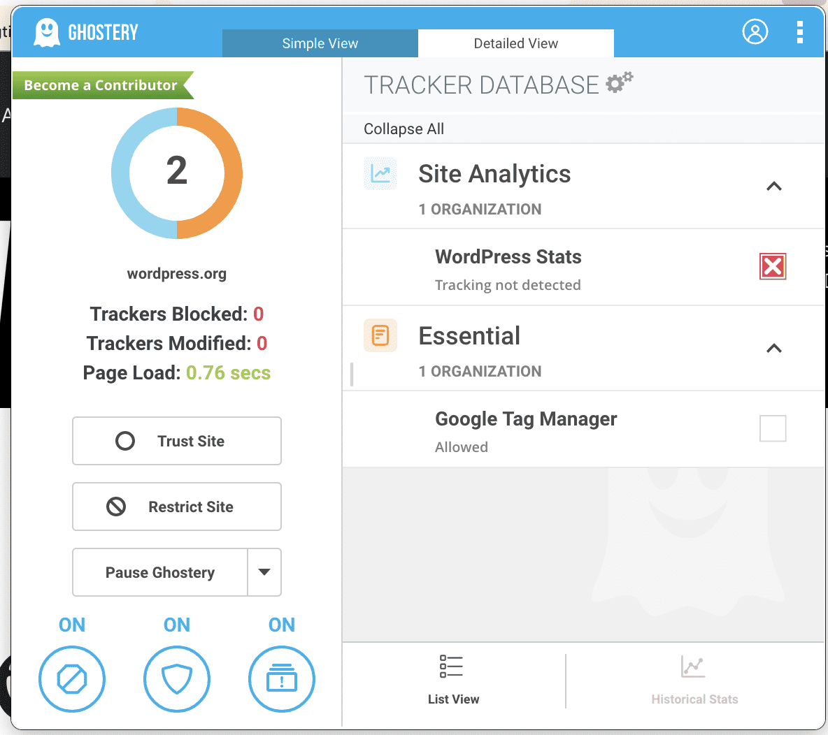 If you follow all this advice and ad-blocking extensions are still causing problems, the next step will be to check their results. Most ad-blocker extensions have tools that allow you to see what is being blocked. This screenshot below shows the Ghostery extension. I’ve tested Ghostery as a visitor to WordPress.org and it has blocked tracking scripts from WordPress and also Google.