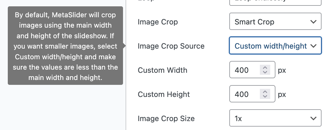 However, in some cases, you may want to use images that are smaller than the slideshow. If you want to use smaller images and not have them resized, go to “Image Crop Source” and select “Custom width/height”. You will then have the option to choose a width and height that is smaller than the main width and height.