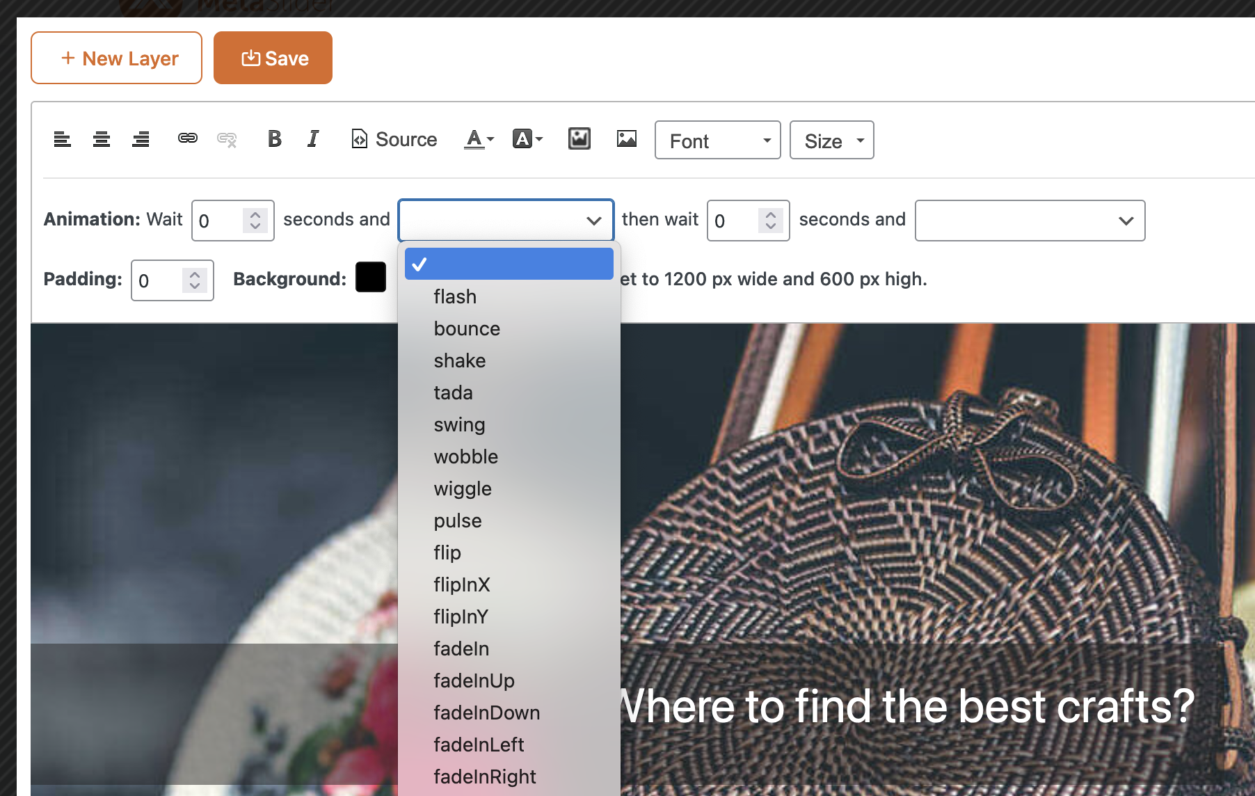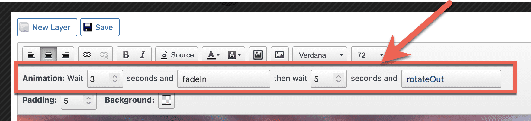 - Use the “Animation” options in the middle role of the toolbar. In this example, the “Sunsets Around The World” heading will wait 3 seconds and then use the “fadein” animation. It will then wait 5 seconds and use the “rotateOut” animation.
