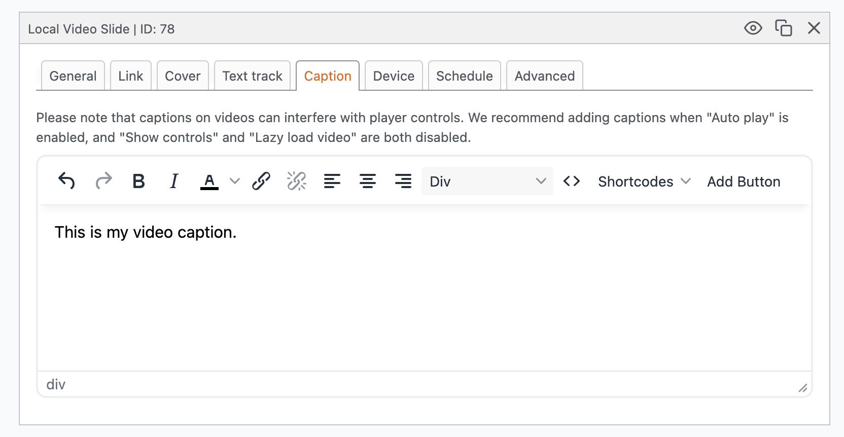 You can enter the captions for any of these slide types using the “Caption” tab. This screenshot below shows the “Caption” tab for a local video slide.