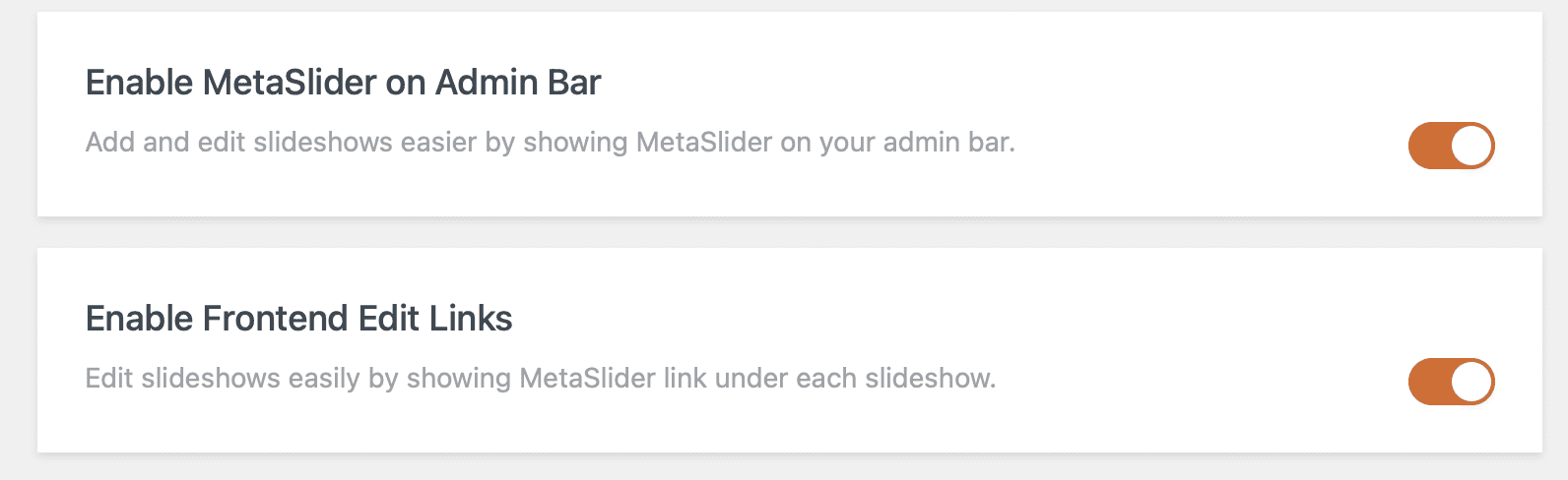 - You’ll find two options, “Enable MetaSlider on Admin Bar” and also “Enable Frontend Edit Links”.