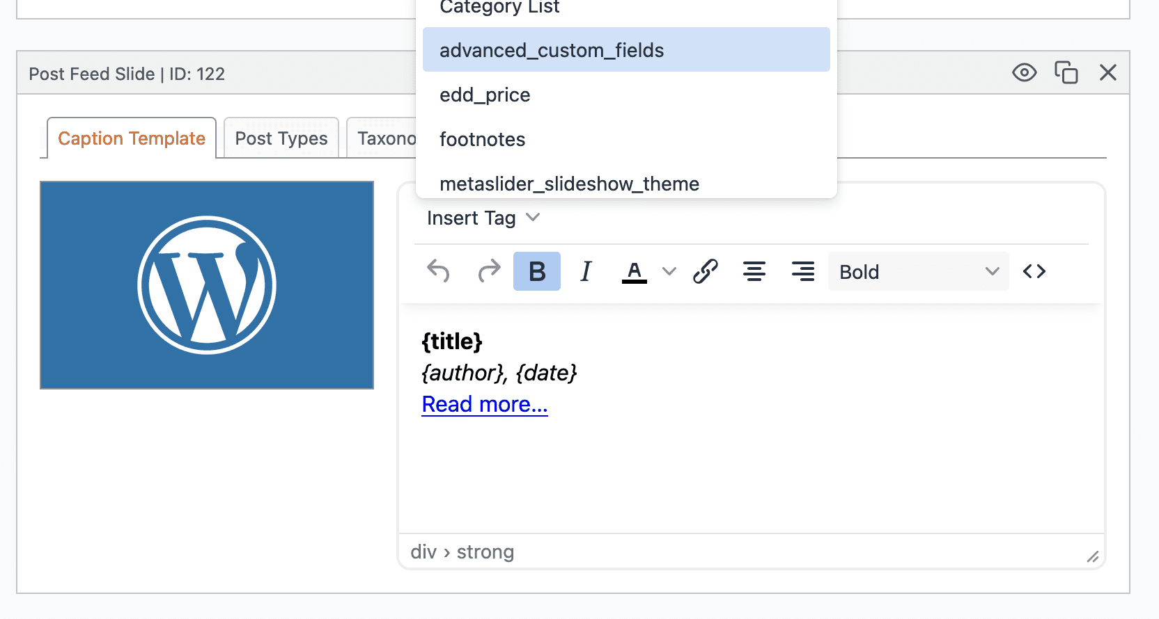 This next screenshot shows how MetaSlider can work with the Advanced Custom Fields plugin. In this screenshot below, we’ve created a field called “advanced custom fields” and can now show it on our slideshow.