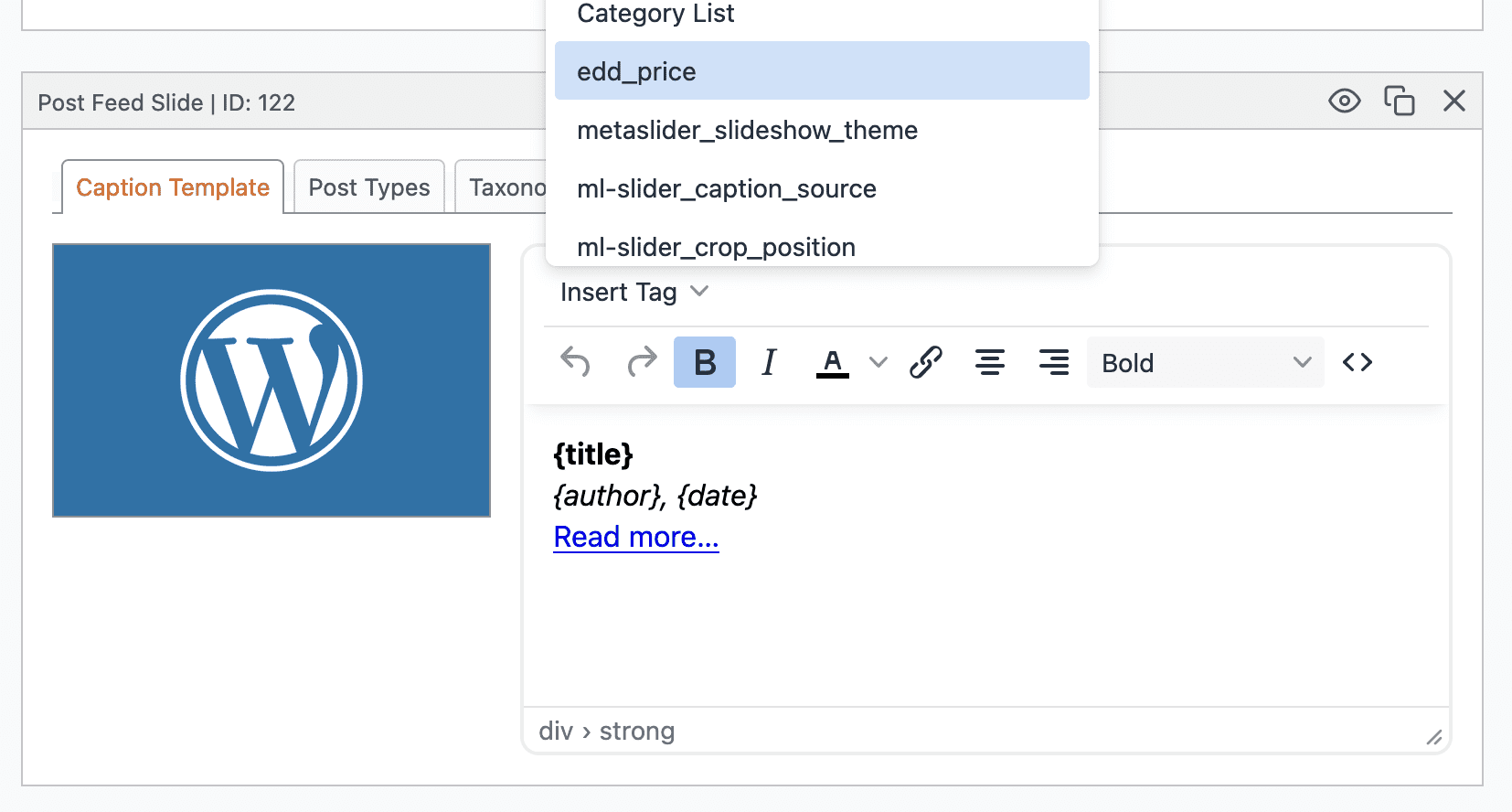 This next screenshot shows how MetaSlider can work with the Easy Digital Downloads plugin. We have created a “Download” product with a price and the “edd_price” field is now available for our slideshow.