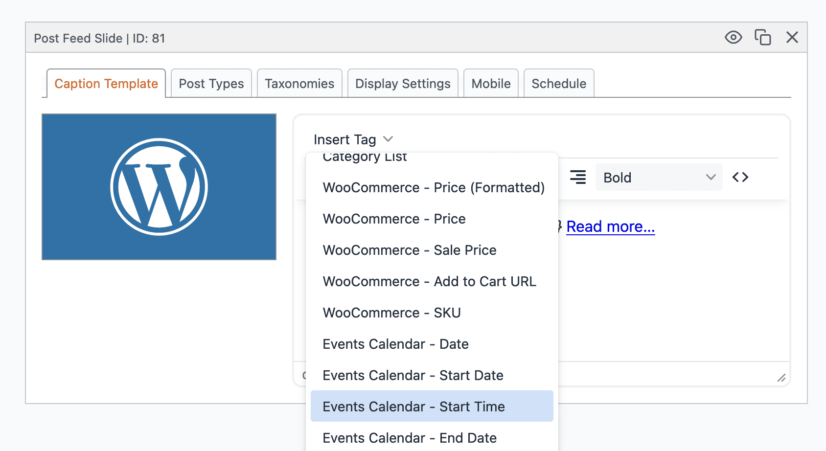 When you add a Post Feed slide, click on the “Caption Template” tab.
