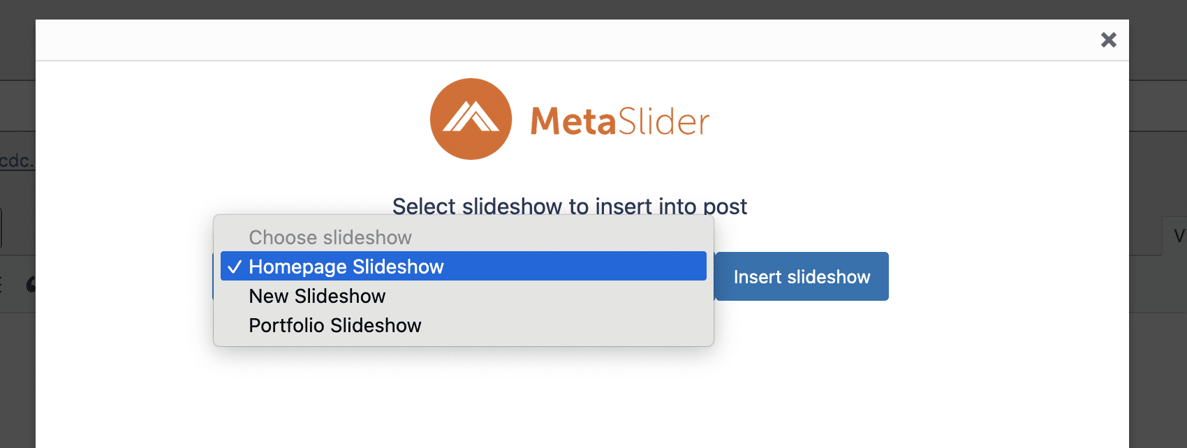 Once you click this button, you’ll see a modal pop-up with an option to choose the slideshow you want. You can see that modal in this next screenshot.