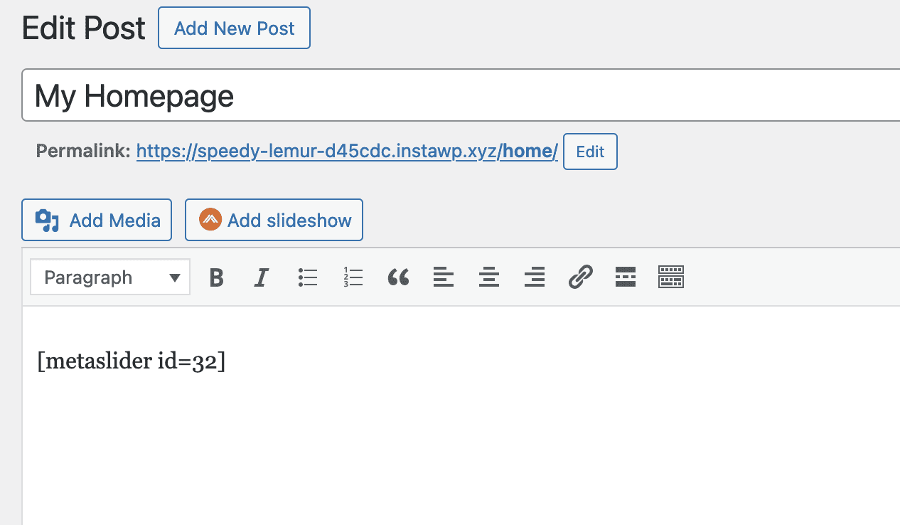 After you choose your slideshow, MetaSlider will insert the correct shortcode for this slideshow, as in the screenshot below.