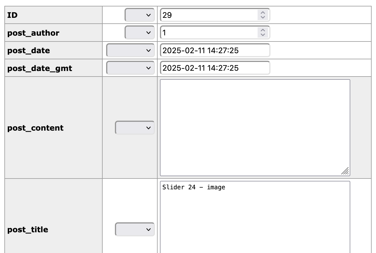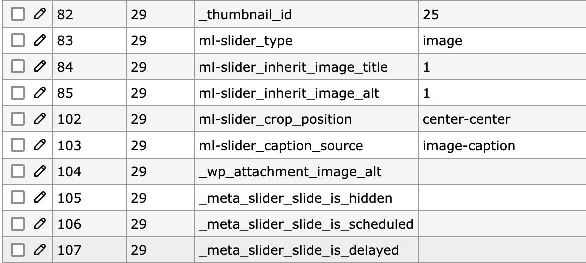 You will also find information about slides in the _postmeta table. This screenshot show information about the slide with an ID of 28.