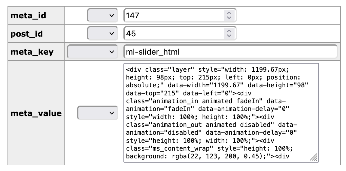 The _postmeta table stores key information for more advanced slide types such as Layer Slides. This screenshot below shows the database content of a Layer Slide.