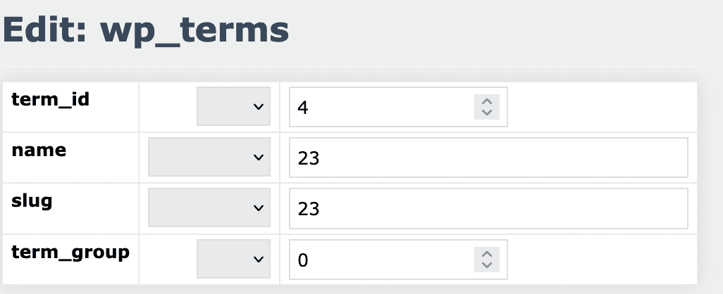This next screenshot is taken from the wp_terms table. There is a term with an name of 23 that corresponds to the slideshow with the same ID.