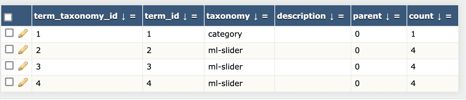 Go to the wp_term_taxonomy table and you’ll see terms that are attached to this taxonomy. This screenshot below shows three terms attached to the ml-slider taxonomy.