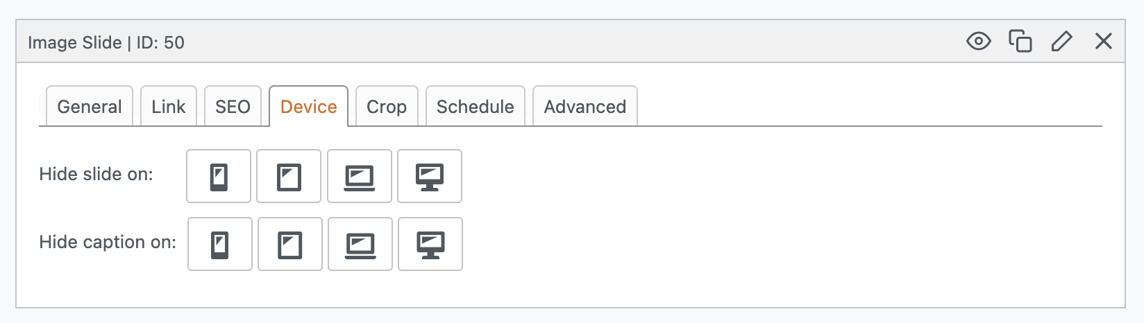Each icon has a tooltip with details of what this option does. For example, if you click the tablet icon, you’ll see the message, “When enabled this setting will hide the slide on screen widths of 768px to 1023px”.