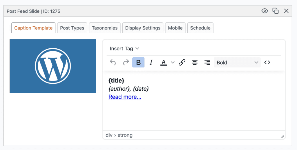 The “Caption Template” tab defines how the slide caption is displayed for each of your posts. We’ve provided 11 template tags to show standard fields such as the post title and publish date. Each of your custom fields will also be displayed in the “Insert Tag” dropdown.