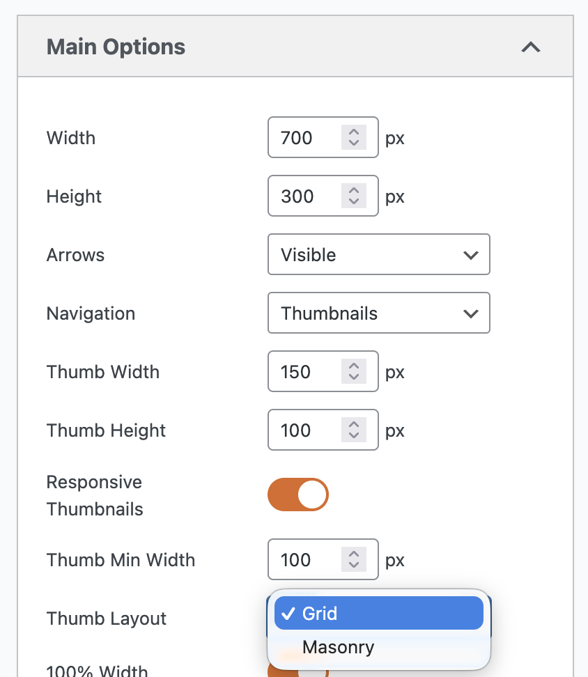 When you place the new slideshow on your site, you may notice that the thumbnails don’t quite match the width of the main image. If you want these to match exactly, go back to the MetaSlider admin area and experiment with some width changes. In this screenshot below, I’m using four thumbnails so I’ve set the overall “Width” to 800px and the “Thumb Width” to 200px. Checking the “Responsive Thumbnails” box will help your images adapt to the space they are placed in.