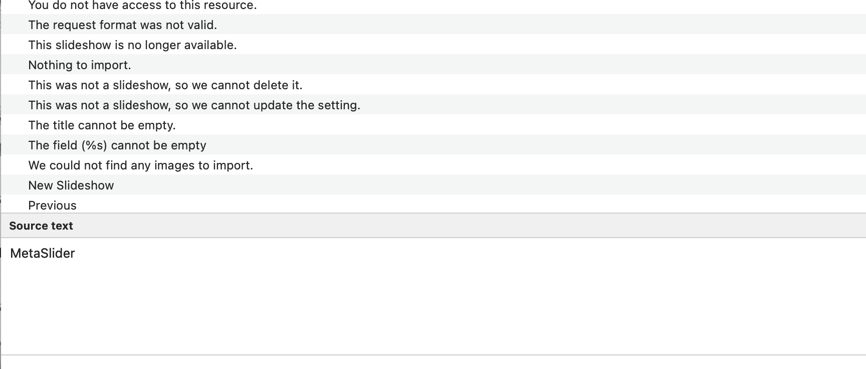 - Save the file. The name should be “metaslider-[langCode]“. Replace [langCode] with the language code you’re translating to. A full list of language codes can be found here. This next screenshot has examples of some translated files for MetaSlider.