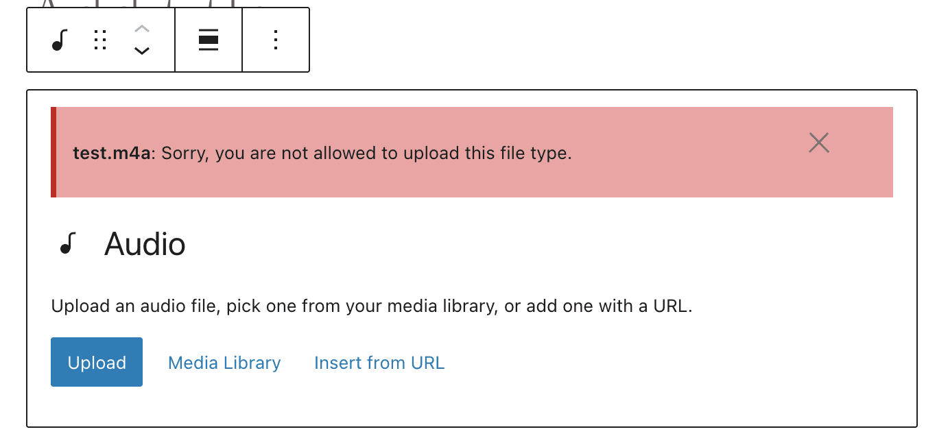 The official list does not include popular audio formats such as .m4a, .aac, and .wma. Those file types are likely to produce an error message when you upload them, as in this screenshot.