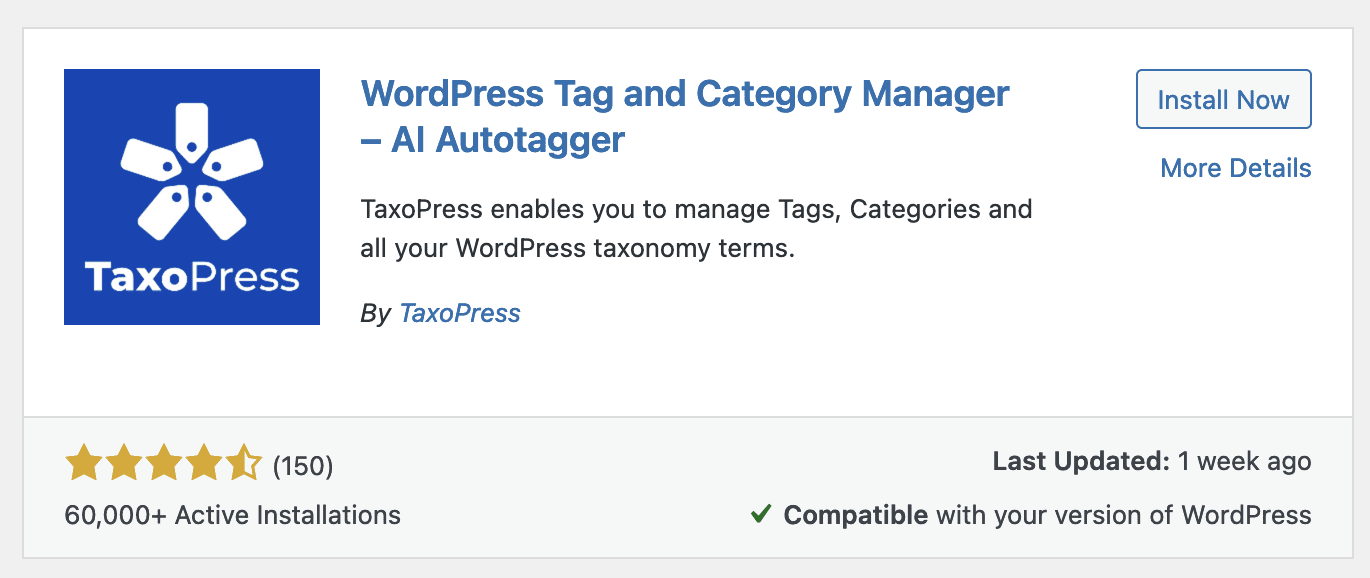 Start by installing the TaxoPress plugin. There’s a free version from WordPress.org. This screenshot below shows how the TaxoPress plugin will appear when you search for it from your “Plugins” screen.