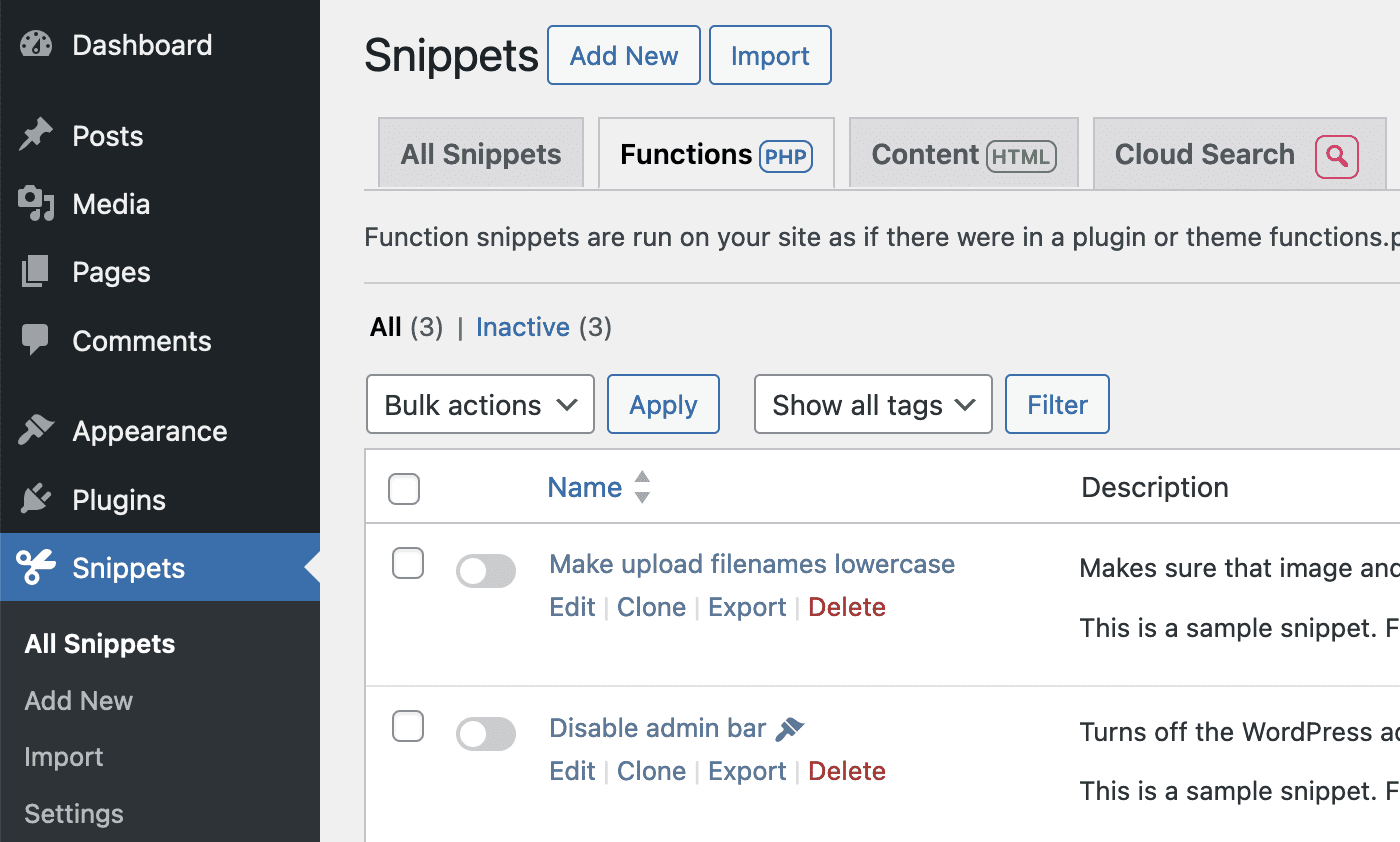 - Install the Code Snippets plugin. This is a highly-trusted plugin with nearly a million users.