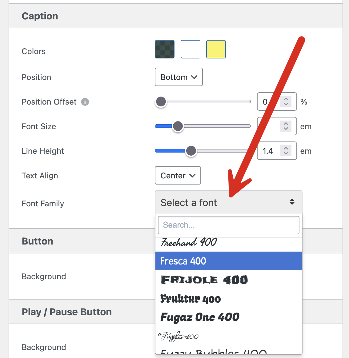 If you’re using MetaSlider Pro, it’s now possible to show captions using almost any font you choose. Inside the “Theme Editor” feature, you’ll now see a “Font Family” option, as in this screenshot below. This feature uses Google Fonts. You can choose from 1,000’s of different fonts.