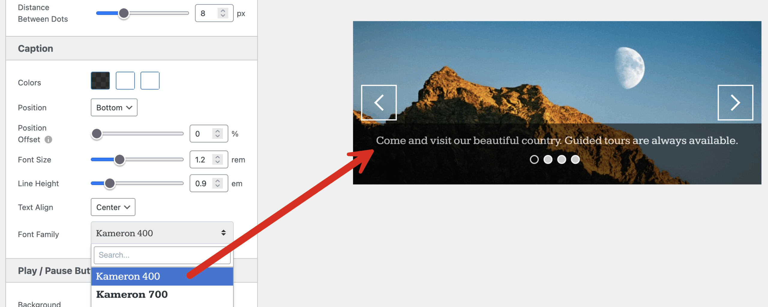 In this example, I’ve chosen the Kameron font for my slideshow. If you want to host these fonts locally for privacy / GDPR concerns, you can do that with a plugin like “Local Google Fonts“.