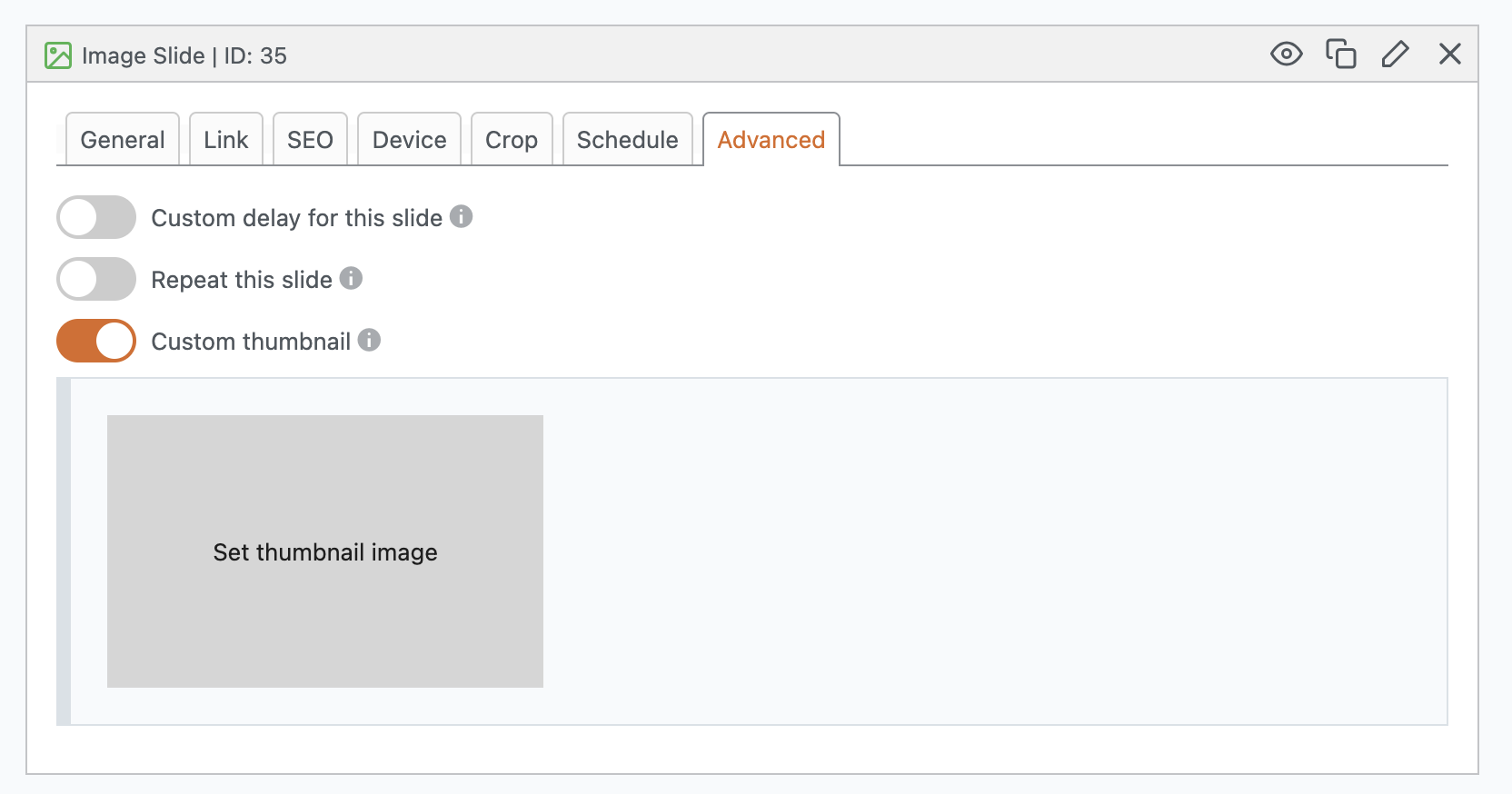 In the latest version of MetaSlider, it’s now possible to choose your own thumbnails if you don’t want them to be generated automatically. Under the “Advanced” tab, enable the “Custom thumbnail” setting and you’ll be able to choose the thumbnail image for each slide.