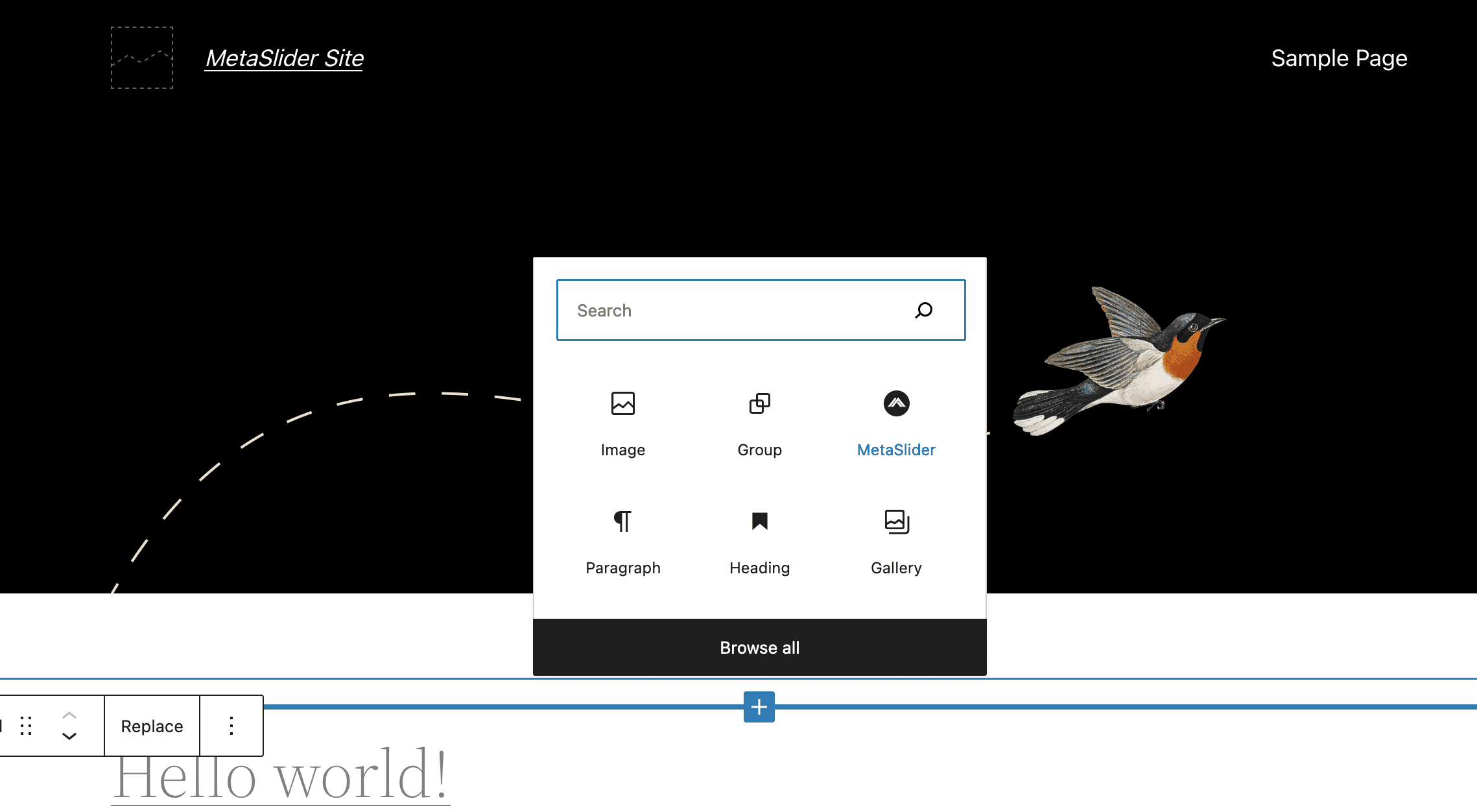 When you’re ready, you can add MetaSlider to a post, page, or your site layout. MetaSlider works great with the Gutenberg editor and all leading page builders. In this next image, I’m adding MetaSlider to the new Full-Site Editing system in the WordPress core.