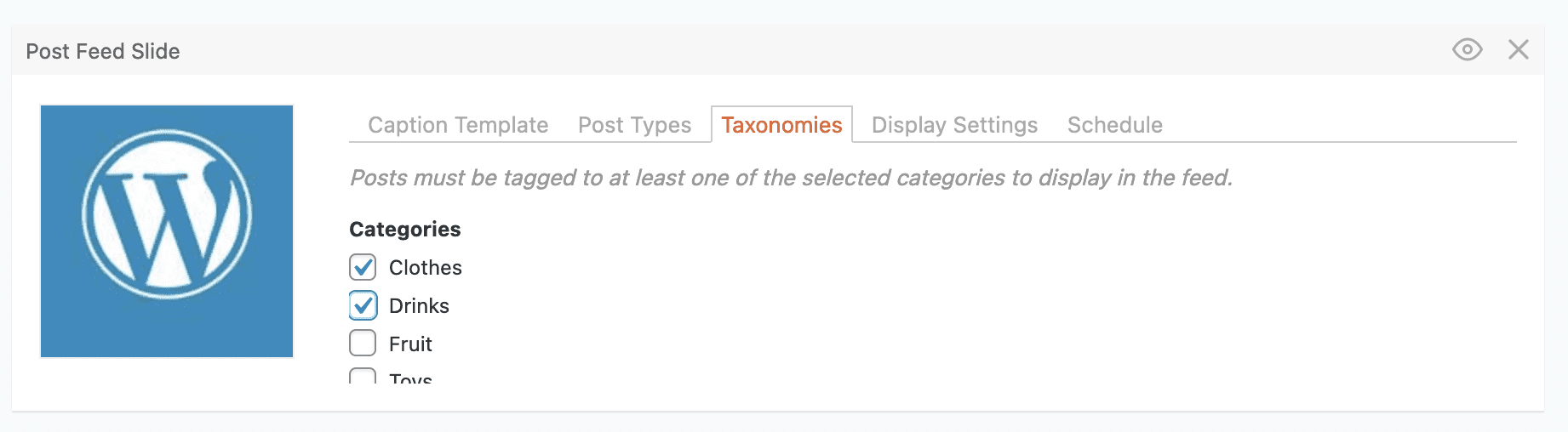On the “Taxonomies” tab, you choose to show posts that have specific categories.