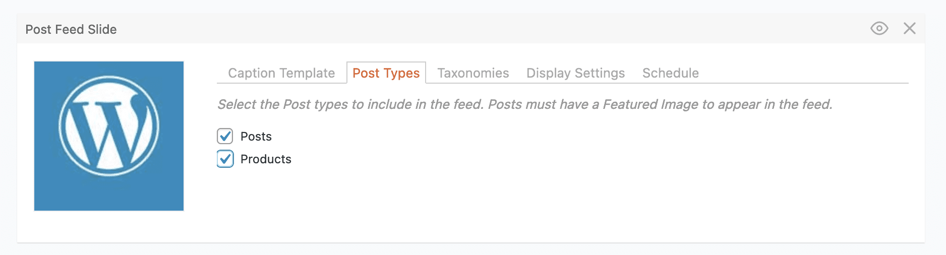 On the “Post Types” tab, you can choose which content you want to show. For example, if you have WooCommerce installed, you can use MetaSlider to showcase your products. If you do use WooCommerce, the slideshow will display the “Product image”.