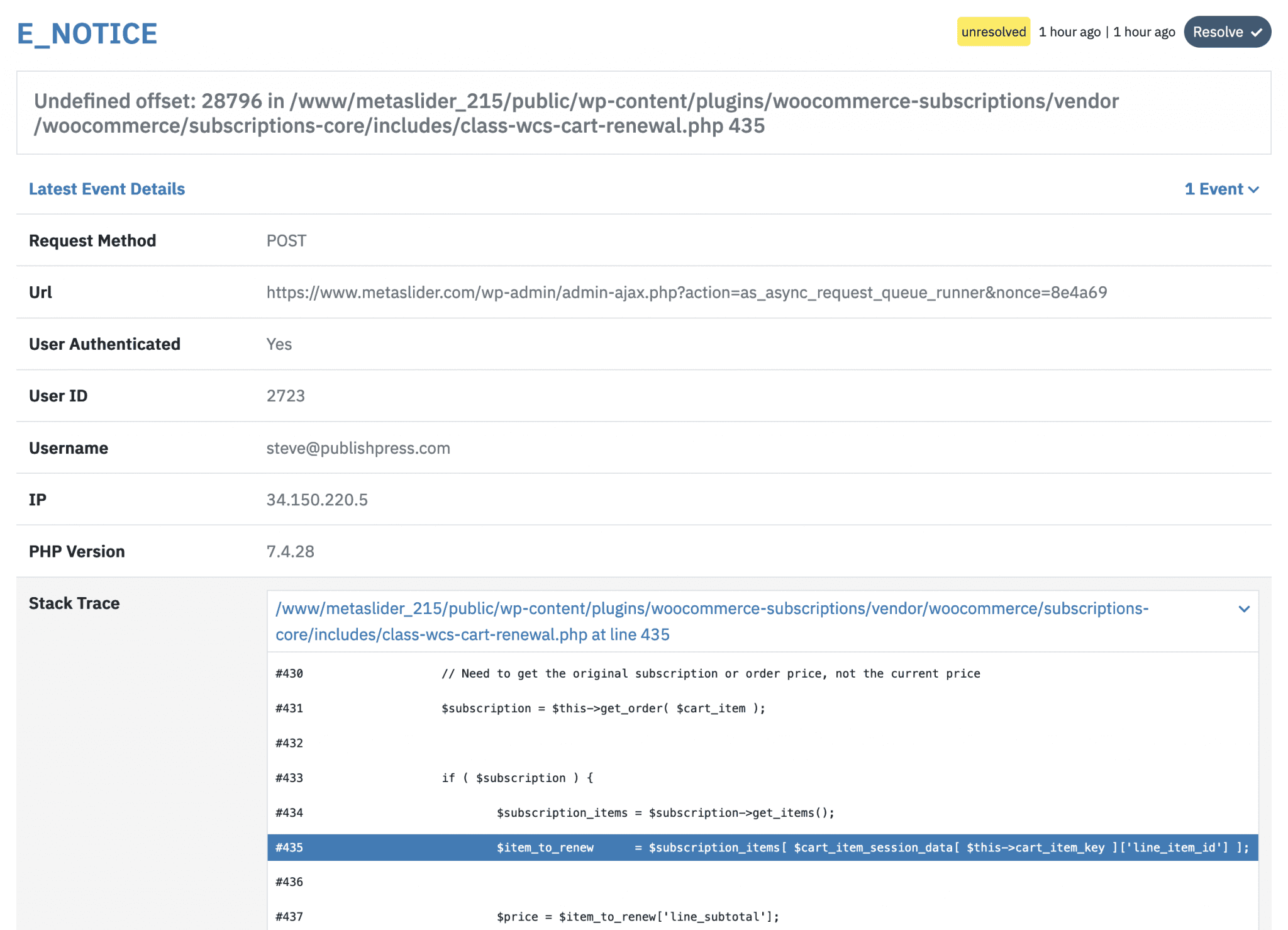 For every error encountered, you can delve into detailed information. Logtivity highlights the problematic file and provides a stack trace. The screenshot below illustrates an error from WooCommerce, specifically related to the WooCommerce Subscriptions plugin. This error report pinpoints the exact line of code and the specific file responsible for the issue. This issue is caused by line #435 in the class-wcs-cart-renewal.php file.