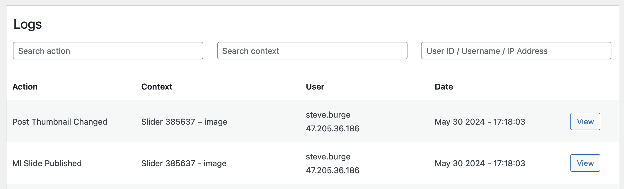 • You’ll immediately start to see the results inside your WordPress Site by clicking “Logitivity” in the admin menu. You’ll also be able to see the logs at https://app.logtivity.io. This image below shows the activity for one user here on MetaSlider.com. You can see everything this user has done including updating posts and uploading images.