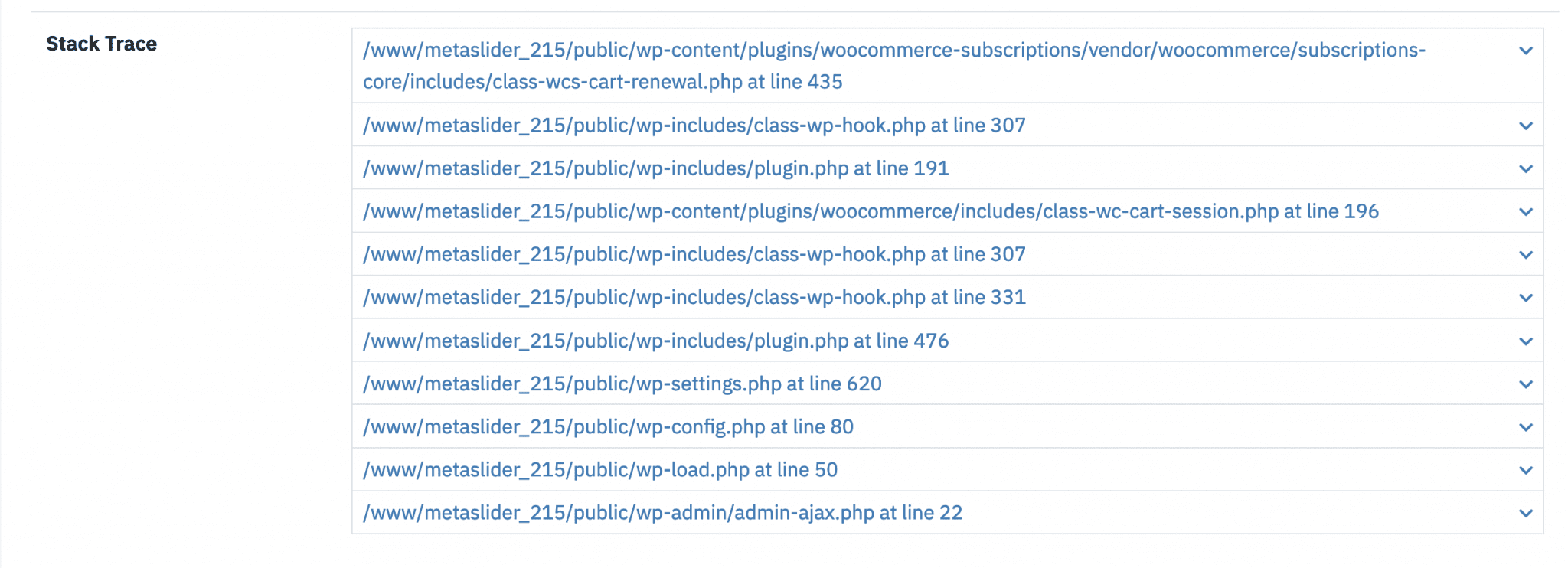 There’s also a full stack trace available so you can track errors back through your codebase. This screenshot below shows the stack trace for the WooCommerce error above. All these features make Logtivity an excellent WooCommerce activity log.