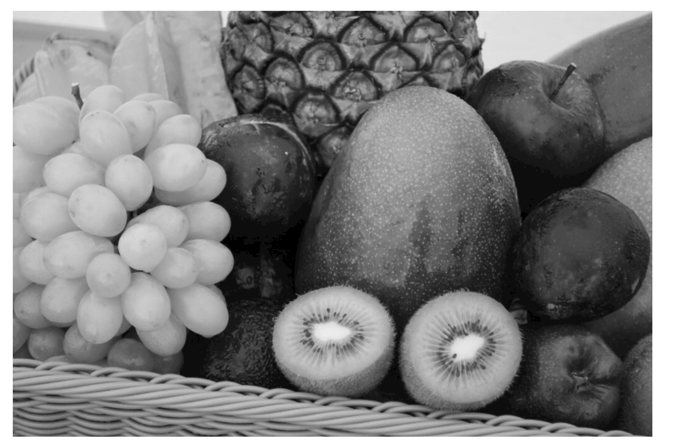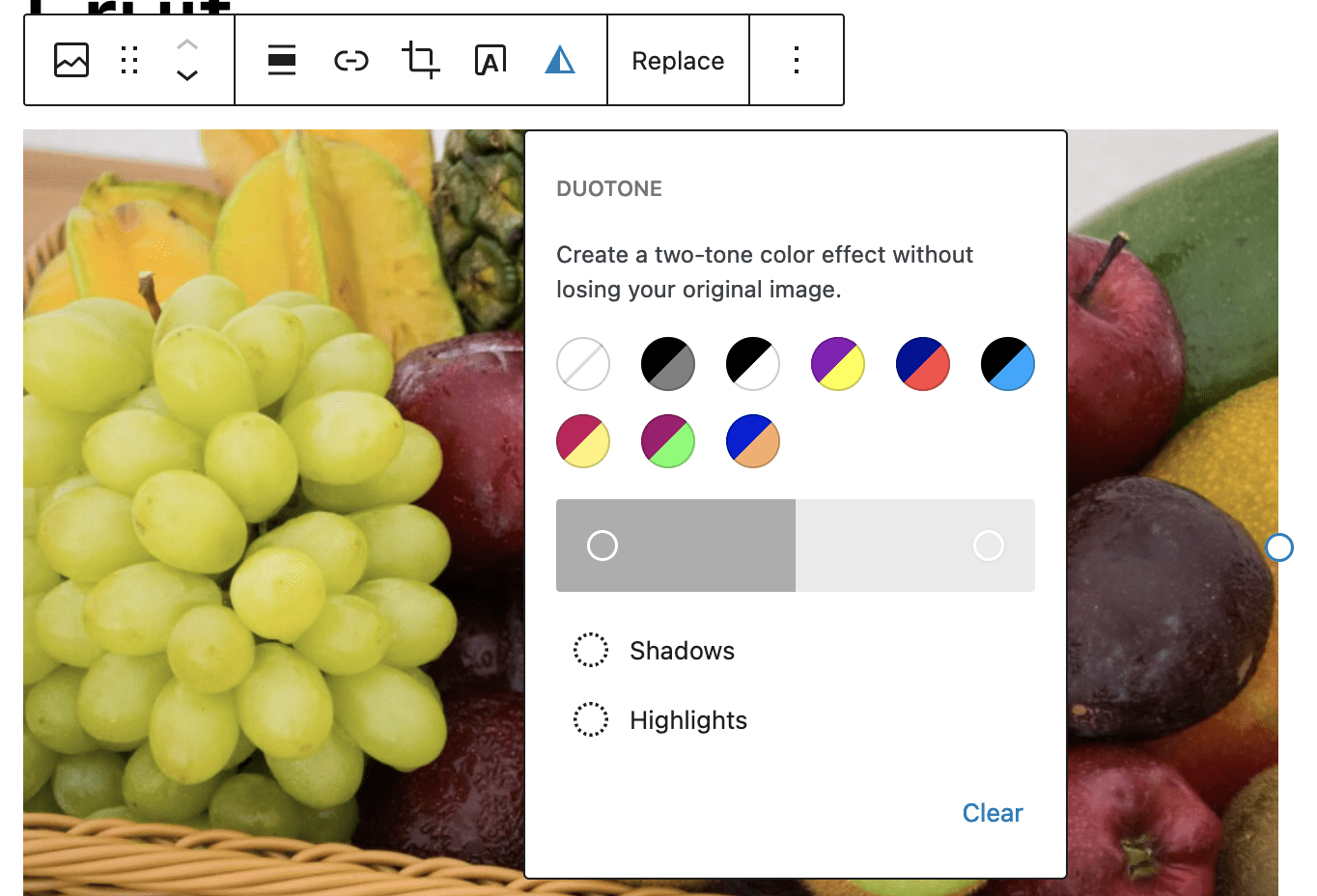 If you click any of these options, your image will immediately change color. This screenshot below is the fruit image with the “Grayscale” Duotone option: